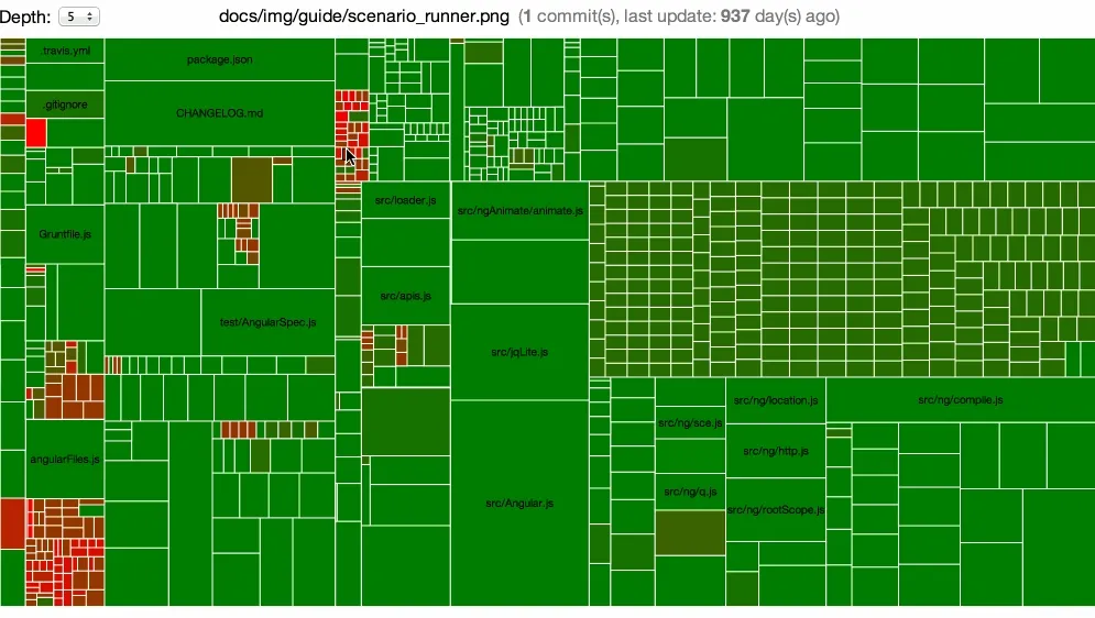 - Large green rectangles show files modified a lot of times, including recently. They probably don’t deserve maintenance attention.