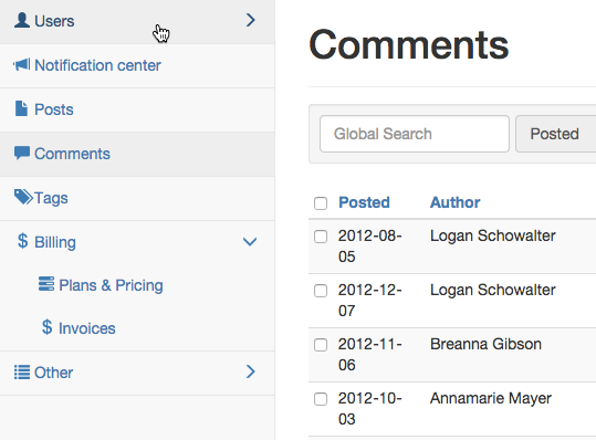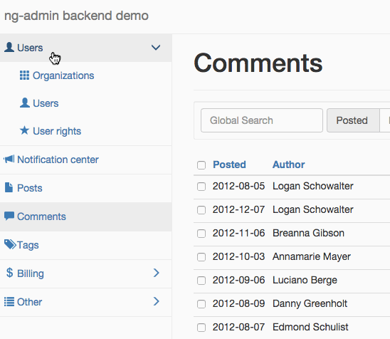 We continue to improve ng-admin, the AngularJS admin GUI consuming any RESTful API, on a daily basis. Version 0.7, released today, packs many improvements developed over the last two months. Configurable menus, batch actions, CSV export, datetime fields, linked drop-down lists, these are the highlights of this new release. Read on to see what’s new in detail.