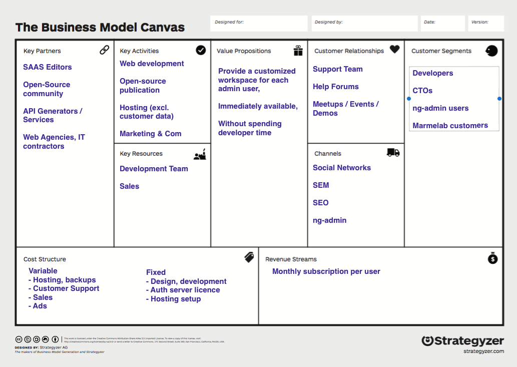 A pivot translates into a new business model. This time, instead of the Lean Canvas, we’re using the Business Model Canvas, invented by Alex Osterwalder and Yves Pigneur. I decided to try this new canvas after attending a talk by Yves Pigneur, where I found the canvas very effective, and the speaker very smart. And it definitely works for Lean Startup products: