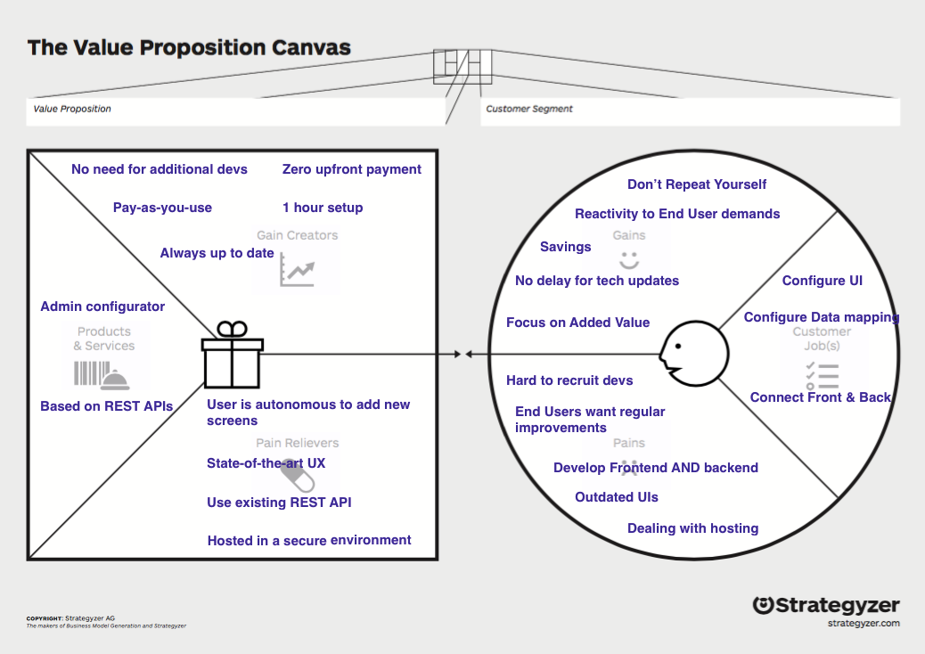 The Value Proposal reads “Provide a customized workspace for each admin user, immediately available, without spending developer time”. Still quite close to our original approach, despite the fact that the main customer segment changed. We dig deeper into this value proposal using Alex and Yves’ Value Proposition canvas, here is what it gives: