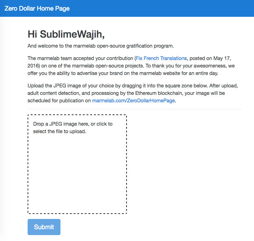 - Claim and image upload Following the comment link, the contributor goes to the admin app. He must sign in with his GitHub credentials to be authenticated. The admin app then calls GitHub to grab the PR details, and to check that the contributor is actually the PR author. If it’s OK, the admin app displays an image upload form. When the contributor uploads an image, the admin app pushes the PR id to the blockchain, and uploads the image to a CDN (named after the PR id). The admin app displays the approximate date of publication of the image based on the number of valid PRs with an image still waiting in the blockchain.