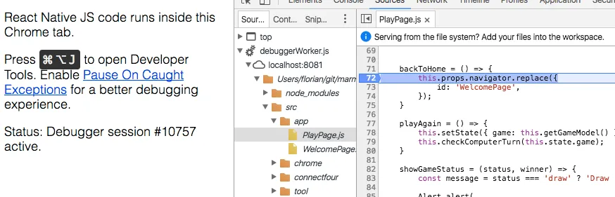 On peut tout simplement ouvrir un onglet dans chrome et positionner des points d’arrêt dans le code qui tourne sur le simulateur. Et à l’aide des source maps, on se croirait vraiment en train de debugger une application javascript web classique, c’est un système très familier et ça facilite donc énormément son accès.