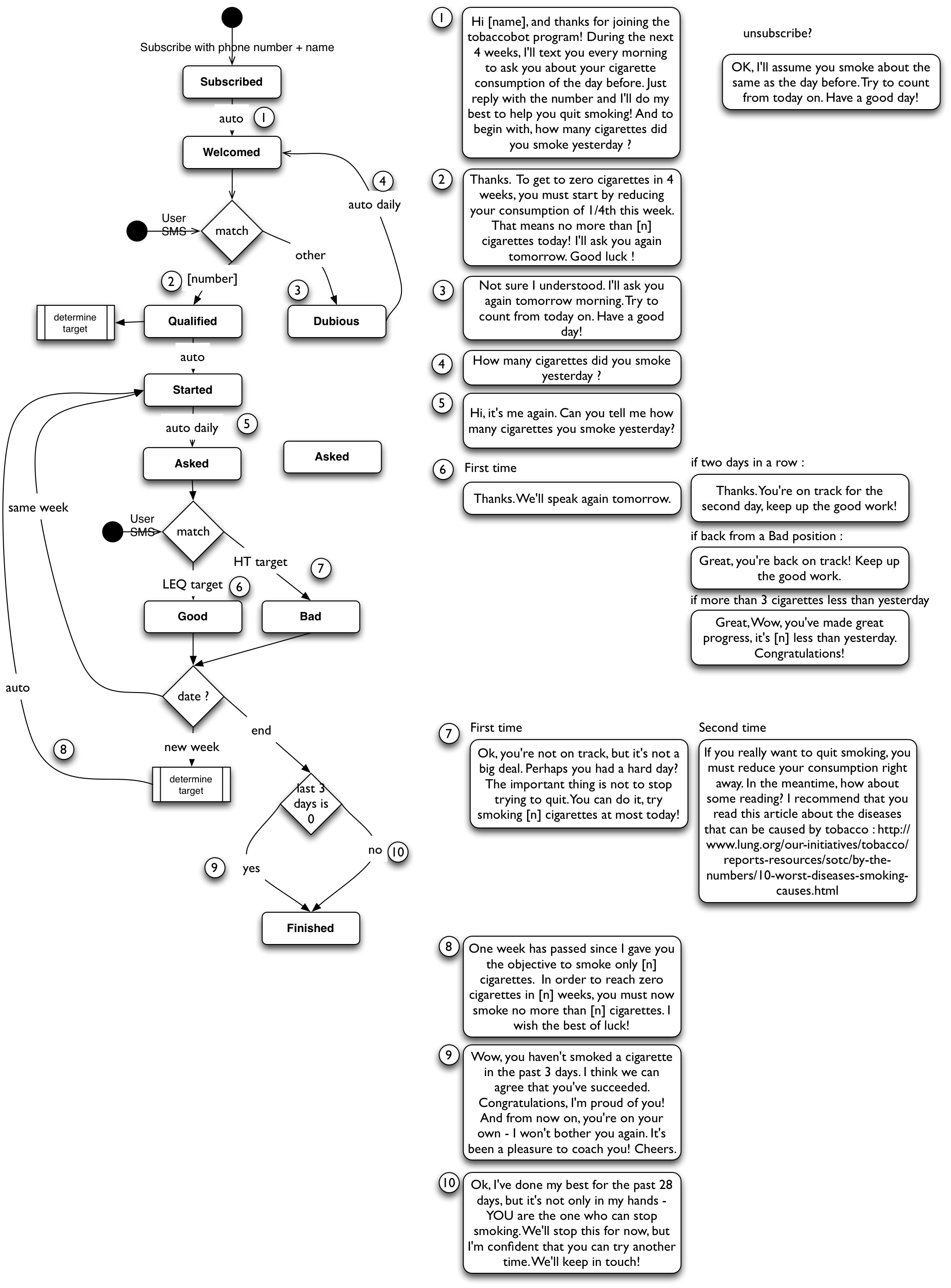 Chaque matin, le fumeur recevra un SMS lui demandant combien de cigarette il a fumé la veille, de manière à évaluer la progression. En fonction de sa réponse, le bot l’encouragera ou le réprimandera. Et les réponses devront varier d’un jour sur l’autre, pour ne pas lasser le fumeur.