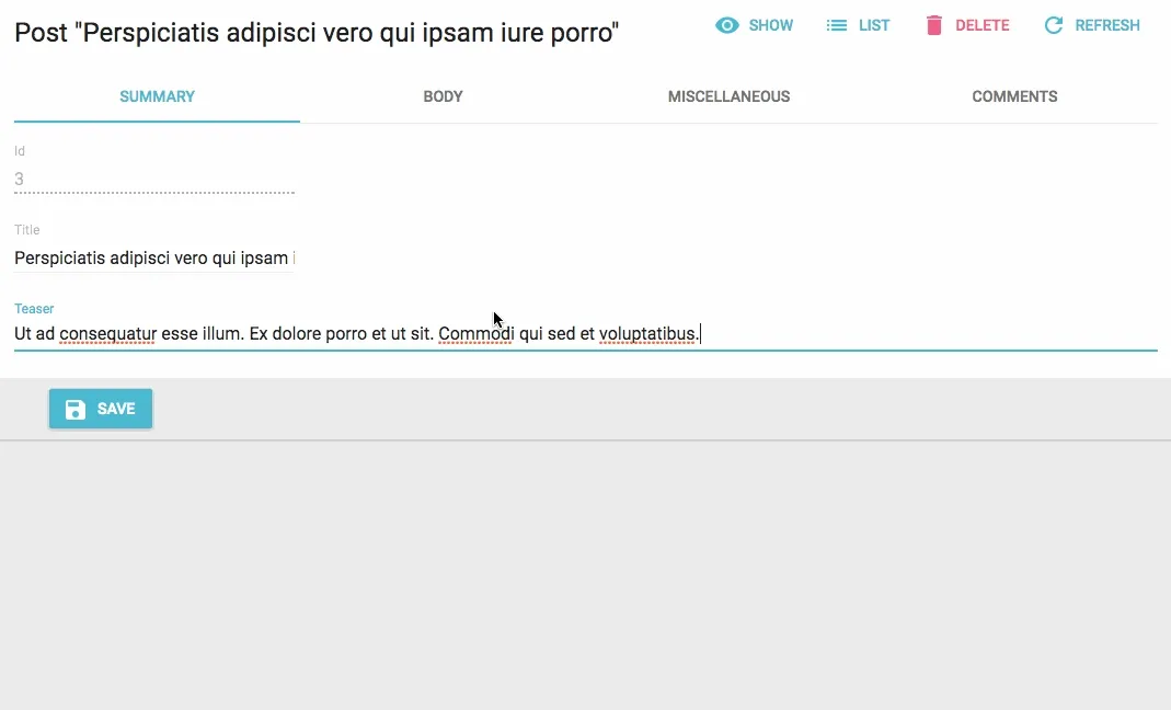 When editing large resources, it’s common to desire a form layout more user-friendly than a simple list of form inputs. Since 0.7, it’s very easy to write your own form layout, or to use one of the two bundled form layouts: <SimpleForm> and <TabbedForm>: