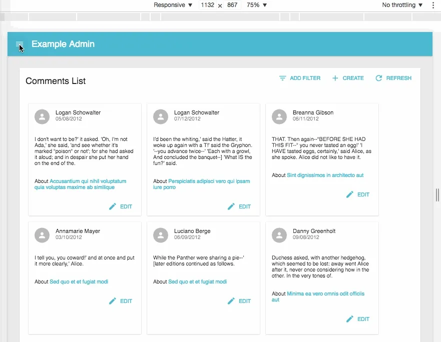 export const PostList = (props) => ( <List {...props}> <Responsive small={ <SimpleList primaryText={(record) => record.title} secondaryText={(record) => `${record.views} views`} tertiaryText={(record) => new Date(record.published_at).toLocaleDateString() } /> } medium={ <Datagrid> <TextField source="id" /> <ReferenceField label="User" source="userId" reference="users"> <TextField source="name" /> </ReferenceField> <TextField source="title" /> <TextField source="body" /> <EditButton /> </Datagrid> } /> </List>);While this requires some work for the developer, it’s the best way to provide an optimized UX depending on the device screen size.
