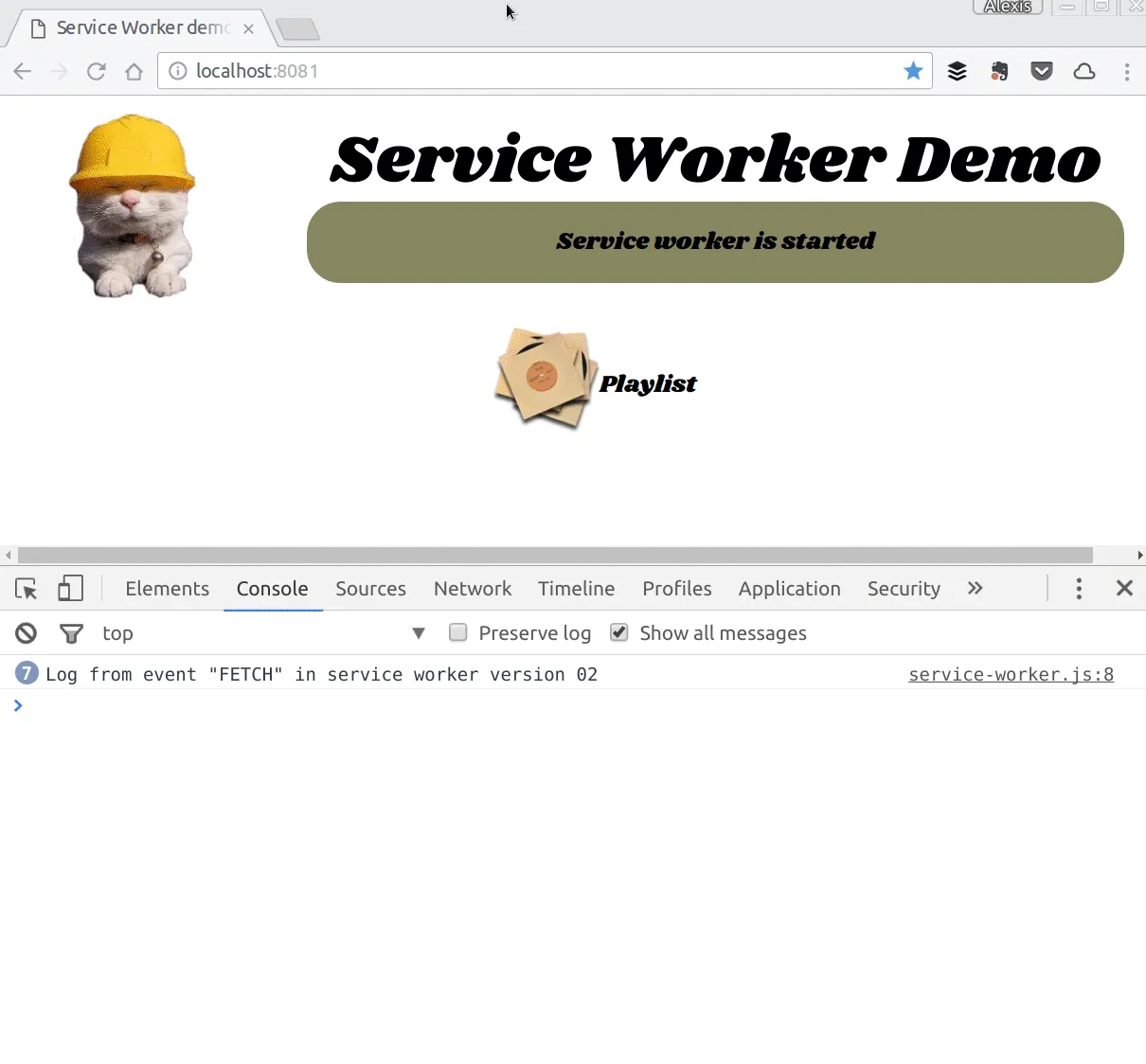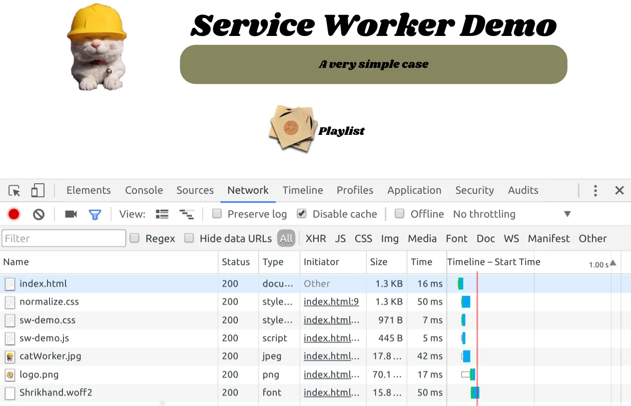 const urlsToCache = [ "/index.html", "/playlist.html", "/css/normalize.css", "/css/sw-demo.css", "/images/catWorker.jpg", "/images/logo.png", "/covers/avecpasdcasque.jpg", "/covers/ryleywalker.jpg", "/covers/xeniaRubinos.jpg", "/js/sw-demo.js",];