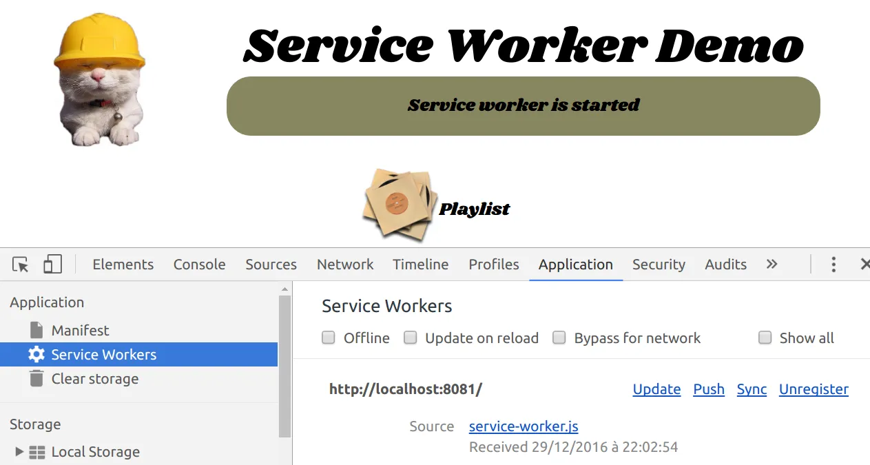 if ("serviceWorker" in navigator) { navigator.serviceWorker .register("service-worker.js", { scope: "/" }) .then(function (reg) { mainMessage("notify", "Service worker is started"); }) .catch(function (error) { mainMessage("alert", "Service worker registration failed with " + error); });} else { mainMessage("alert", "Your browser do not support Service Worker");}Dans cet exemple, la fonction mainMessage affiche le message passé en paramètre dans le gros cartouche gris-vert à côté du lapin. Ca permet de voir ce qui se passe !