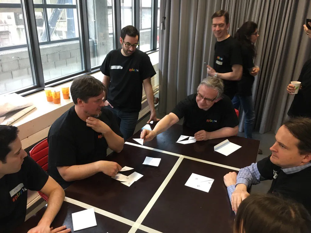 The #play14 participants share the opinion that having fun at work is a great thing. It boosts our motivation, it makes us more efficient, it spreads the knowledge across teams more quickly, and it reduces the HR costs linked to recruitment and training. But more specifically, they believe in the power of non-software games. At #play14, I didn’t see a single workshop where people stared at a screen. Instead, they look at each other, and participate with their hands, their mouth, and their body.