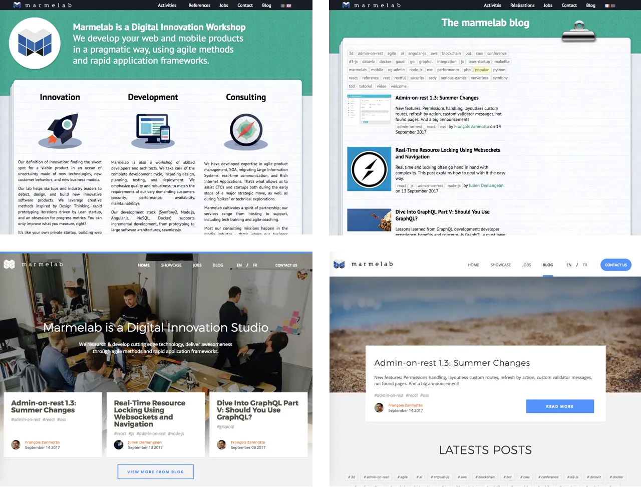 We released the initial marmelab.com website in 2013. In today’s standards, the previous design looks very dated (skeuomorphism was already living its last days back then). Besides, the old website didn’t look too great on mobile. Last but not least, the most visited content (our blog) wasn’t shown prominently in the home page.