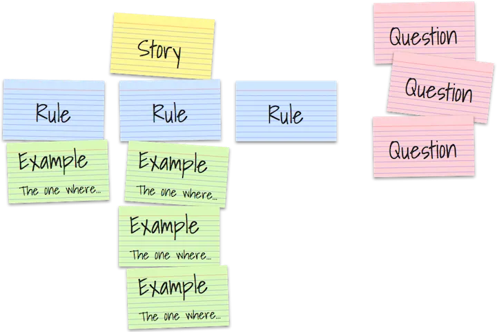 Si personne n’est capable de répondre à une question, il est important de bien l’identifier comme une question en suspens (carte rouge). Et comme vous pouvez le deviner, nos exemples sont nos futurs acceptance tests.