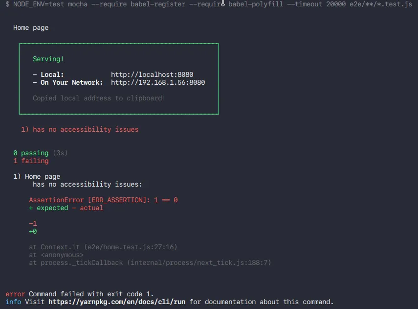 yarn add --dev babel-register babel-polyfill mocha selenium-webdriver@3.6.0 selenium-standalone serve axe-webdriverjs