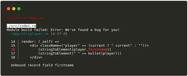 let make = (~player, _children) => { ...component, render: (_self) => <div className=("player")> (stringToElement(player.name)) </div>};I created the component template in combination with the statelessComponent function from the ReasonReact module. Spreading ...component is a bit like saying my component “inherits” from statelessComponent, except that