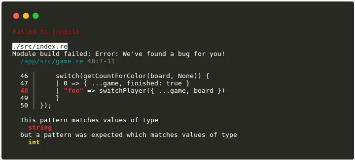 let getCell = (x, y, cells) => switch (List.find(cell => cell.x == x && cell.y == y, cells)) { | ({ color }) => color /* color is extracted from the cell record */ | exception Not_found => None };Naturally, matching also comes with destructuring. That’s why it’s even possible to extract parts of data structures easily, even from functions args!