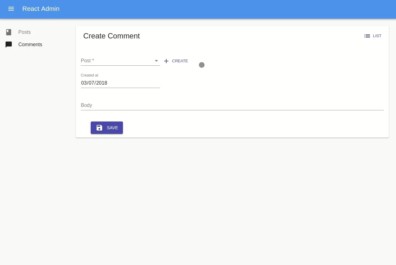 return ( <Create {...props}> <SimpleForm defaultValue={{ created_at: today, post_id }} redirect={redirect} > <ReferenceInput source="post_id" reference="posts" allowEmpty validate={required()} > <SelectInput optionText="title" /> </ReferenceInput> <DateInput source="created_at" /> <LongTextInput source="body" /> </SimpleForm> </Create> );};I’d like to add a New button next to the posts ReferenceInput. Let’s first figure out how we are going to retrieve the id of a newly created post, and pass it to our ReferenceInput.