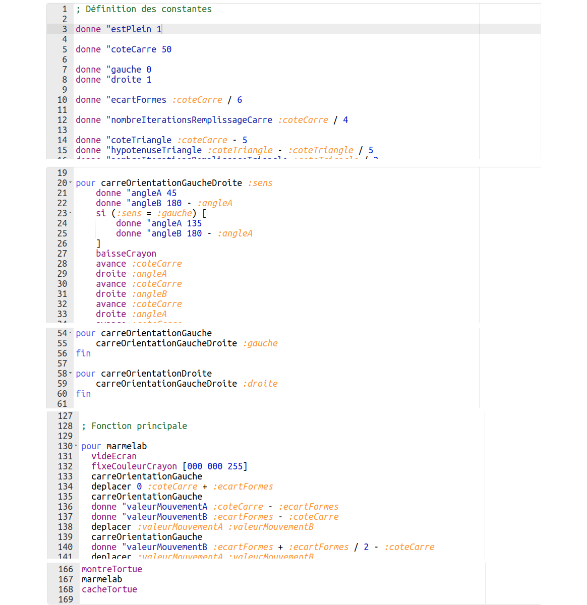 Le formatage du code est un point important. En LOGO toutes les instructions peuvent être combinées sur une seule ligne sans séparateur Et on peut rapidement avoir quelque chose de parfaitement illisible et non maintenable